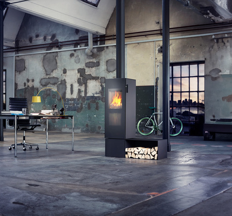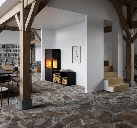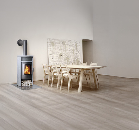 Poêle à bois VIVA 140 L en couleur platine avec porte de foyer plein verre sur mur en bois dans une maison d'habitation rustique