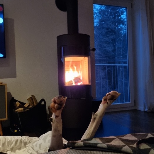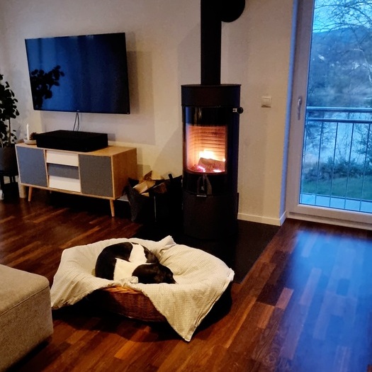 Da quando Pia ha ricevuto la stufa, il suo riscaldamento è stato spento e trascorre le serate dopo lo sport cinofilo di soccorso con il suo cane Lani davanti alla stufa, spesso con amici e un bicchiere di vino rosso italiano.
