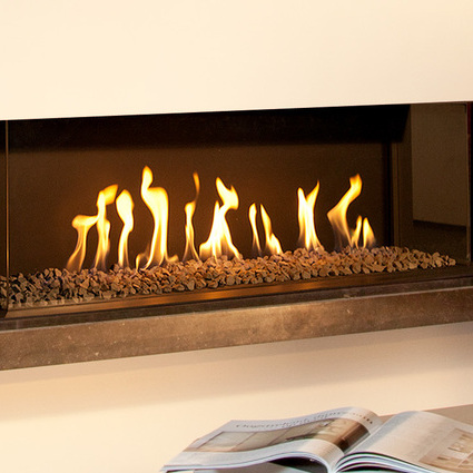 Il pannello di vetro senza cornice offre una visione ininterrotta delle fiamme e il design può essere facilmente integrato in vari interni. Il camino a gas può essere personalizzato scegliendo tra vari rivestimenti e riempimenti interni, come ciocco, criponite e pietre.
