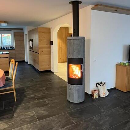 Stufa a legna JUNO 166 L con rivestimento in pietra naturale "Porto" e porta del focolare in vetro in un ampio soggiorno nei colori della terra