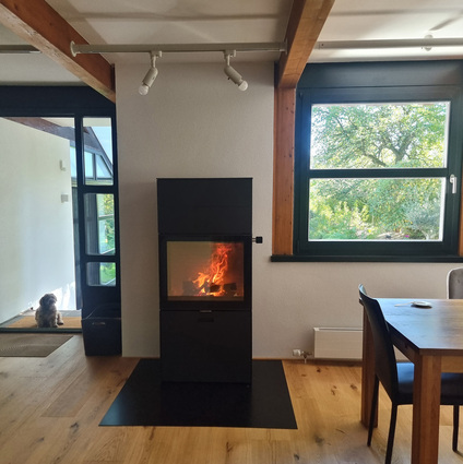 Stufa a legna MAX 600/150 in nero con una finestra laterale e due panche laterali come modello ad angolo in sala da pranzo aperta et spaziosa