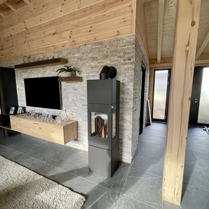 Stufa a legna NEXO 160 in nero con porta in acciaio e finestra laterale al centro della zona giorno tra sala da pranzo e soggiorno