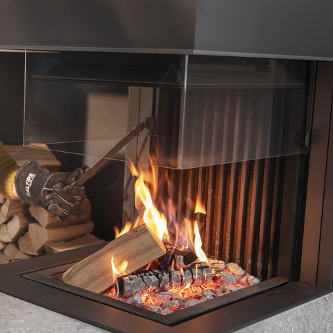 Schermo e vetro di un camino a legna Kalfire in un unico pezzo con vista su fiamme, ciocchi e brace