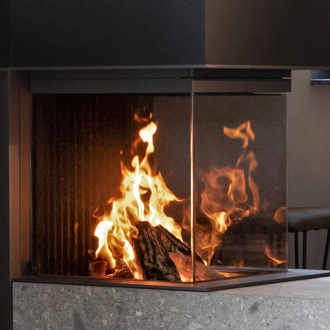 Camino a legna VISIO 3:1 UNIQ come divisorio per ambienti tra sala da pranzo e soggiorno